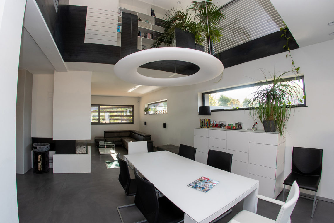 La maison W est une maison unifamiliale d’une surface nette utile et habitable de 290 m2. Le rez-de-chaussée accueille l’espace séjour/salle à manger. A cet endroit se trouve également une cave à vin accessible par une trappe électrique. La partie living et salle à manger, de même que la cuisine attenante sont équipées de portes coulissantes vitrées élargissant la vue sur les terrasses situées à l’avant et les espaces extérieurs.