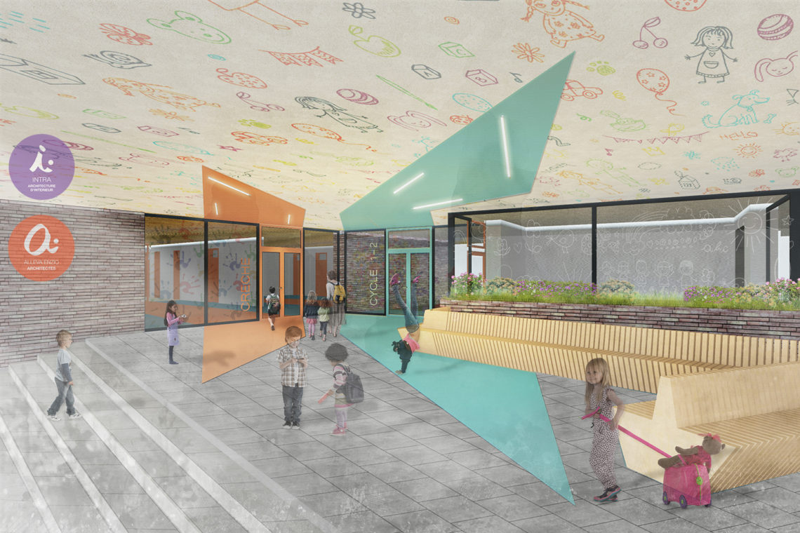 Au sein de l’immeuble, un jeu de couleurs, se trouvant au plafond et au sol, permet de manière ludique d’orienter les enfants dans leurs cycles et entrées relatives.